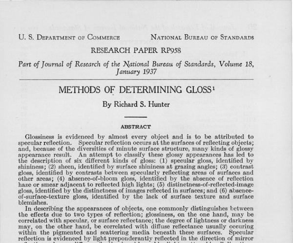 El artículo «Methods of Determining Gloss» de Richard S. Hunter, publicado en 1937 en el Journal of Research del National Bureau of Standards, aborda la compleja tarea de cuantificar el brillo de las superficies. Hunter destaca que el brillo es una propiedad óptica inherente a muchas superficies y es percibido debido a la reflexión especular. Sin embargo, los métodos para medirlo son variados y no siempre precisos, debido a la dificultad de separar completamente la reflexión especular de la reflexión difusa.